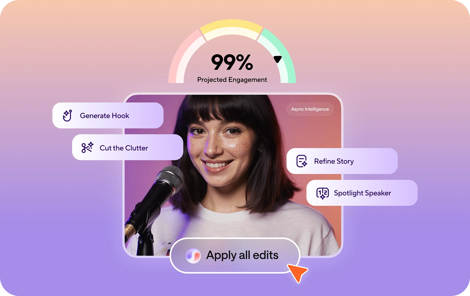 The new era of engagement optimization is here. Async Intelligence thinks like your viewers, edits your recording automatically around what hooks them, and maximizes retention with one click.