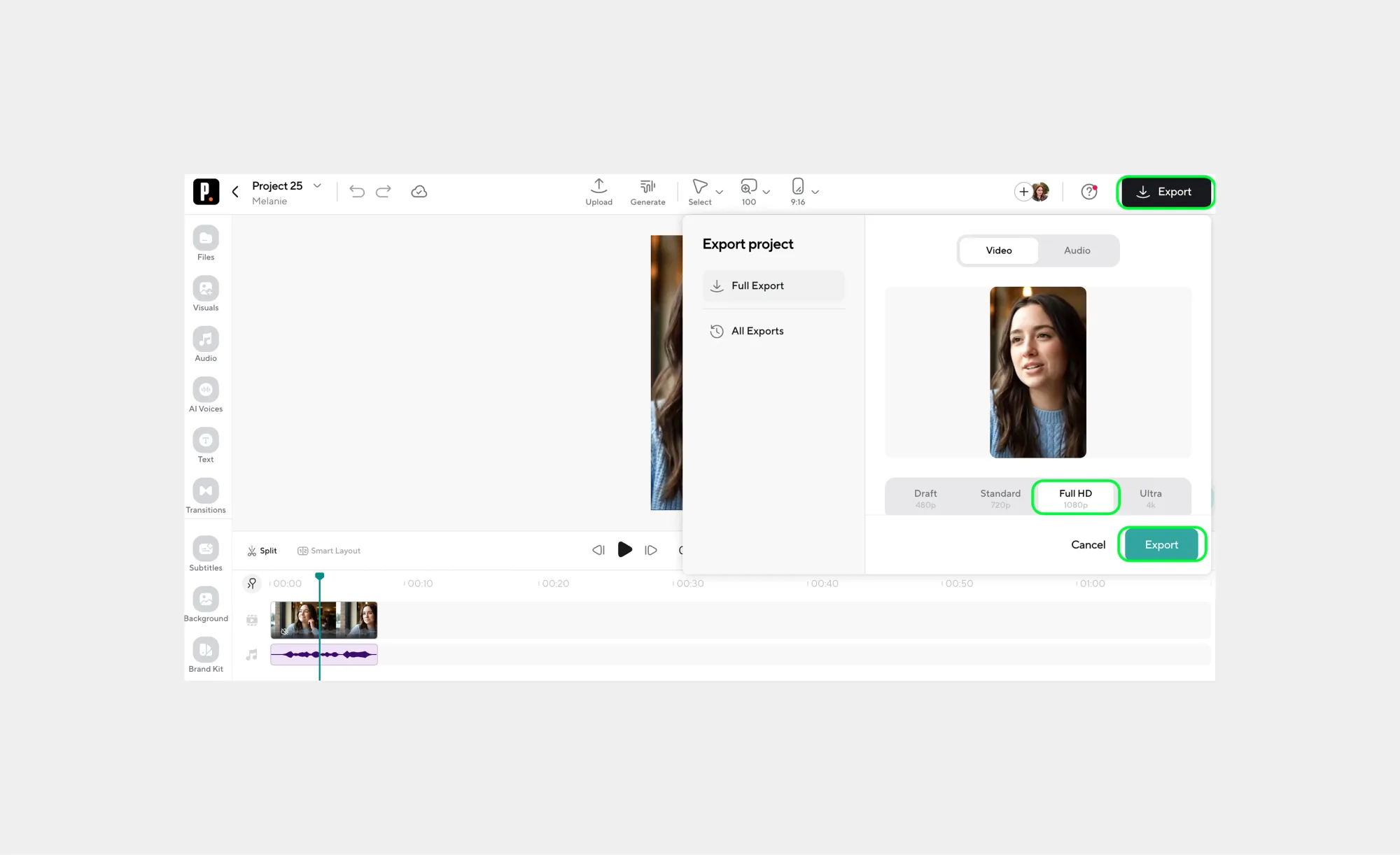 Export your video in the resolution you need, and voilà! After a few seconds, you’ll get a ready-made video for YouTube Shorts, Reels, or TikTok.