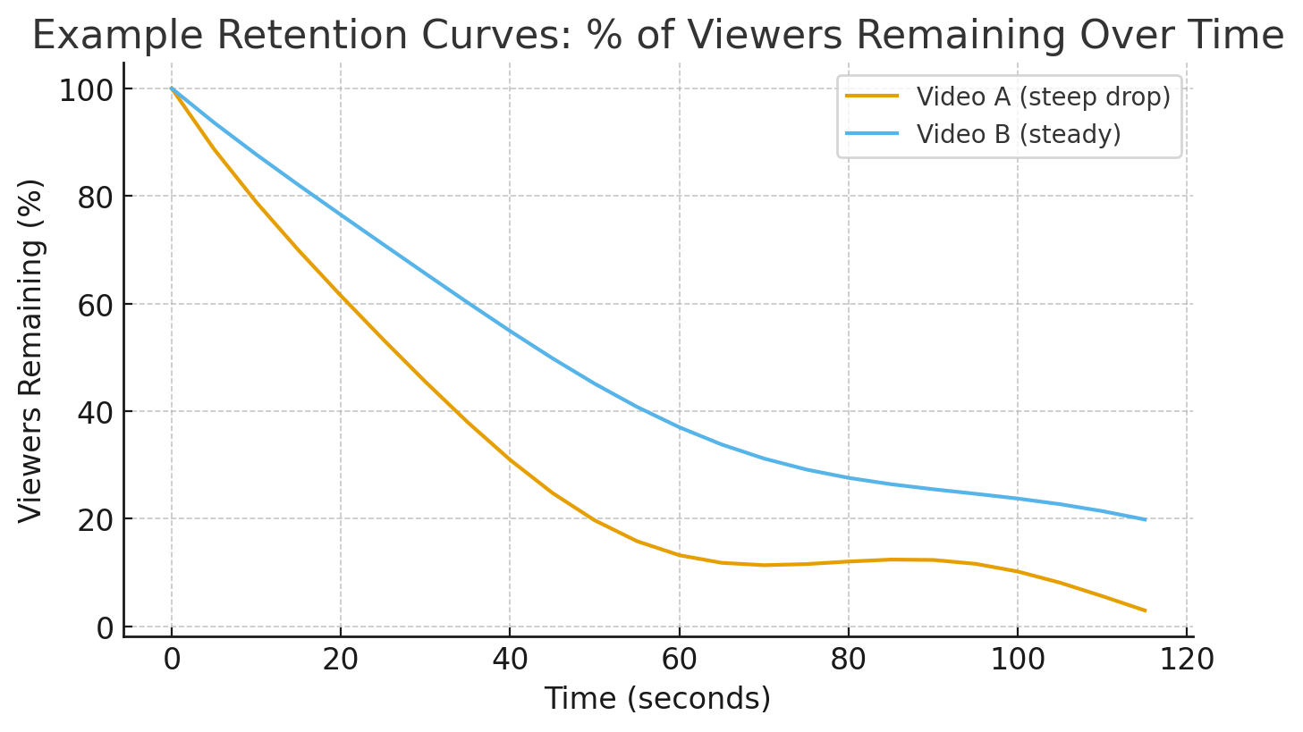 The chart below shows two videos with the same topic. Video A spikes early then loses viewers quickly; Video B holds attention with steadier pacing. Even with fewer initial views, Video B is more likely to be recommended because it sustains viewing longer, improving overall watch time and video engagement rate. (Your platform analytics will show a similar retention chart).