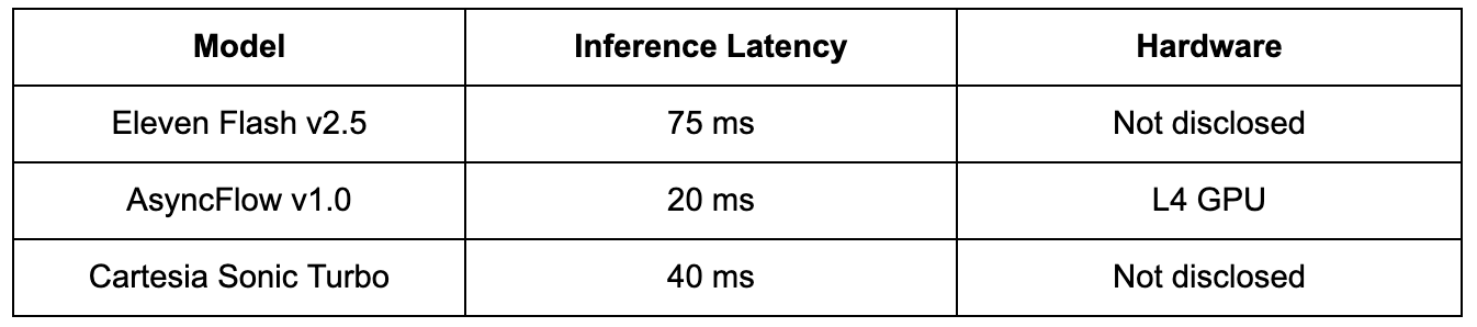 Note: AsyncFlow’s architecture is optimized for L4 GPUs, achieving near floor-level inference times of ~20 ms. The lack of disclosed GPU info from ElevenLabs and Cartesia suggests their results may rely on higher-tier GPUs, which makes AsyncFlow’s efficiency-to-cost ratio stand out even more.