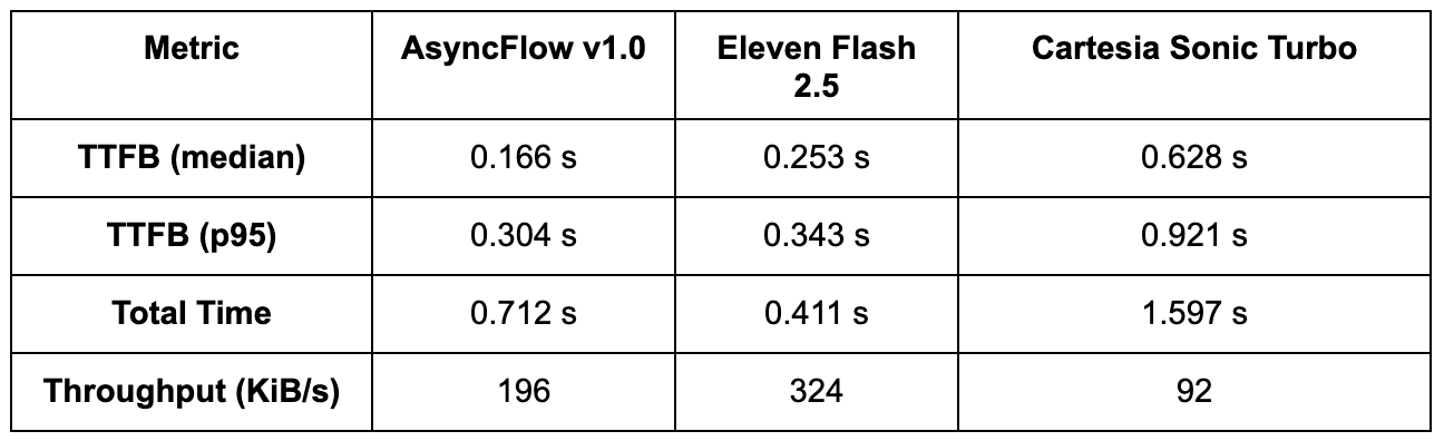• AsyncFlow delivers audio earliest; its sub-200 ms median TTFB makes it ideal for interactive or conversational applications where users expect speech to start almost instantly.