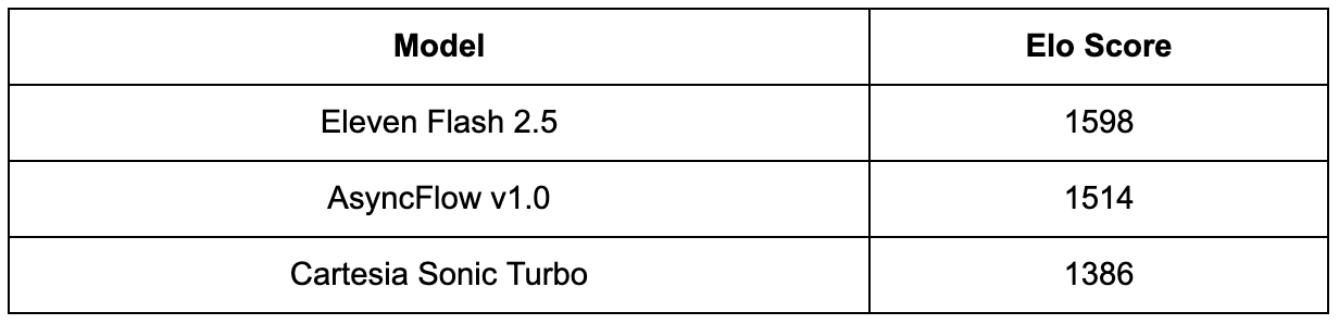 • Eleven Flash v2.5 achieved the highest Elo score, demonstrating slightly stronger prosody control and expressive clarity, particularly for emotional or punctuation-heavy prompts.