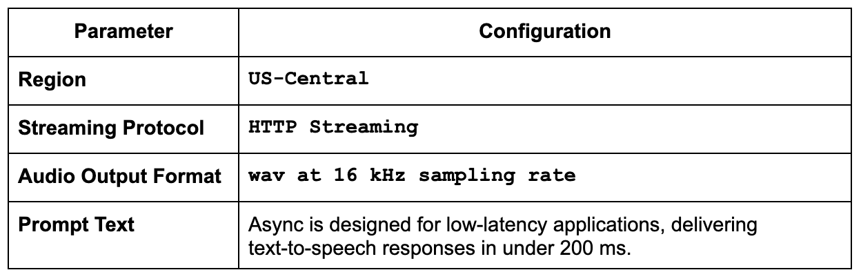Want to run these tests yourself? Explore the Async Voice API documentation and try the benchmark script with your own inputs.